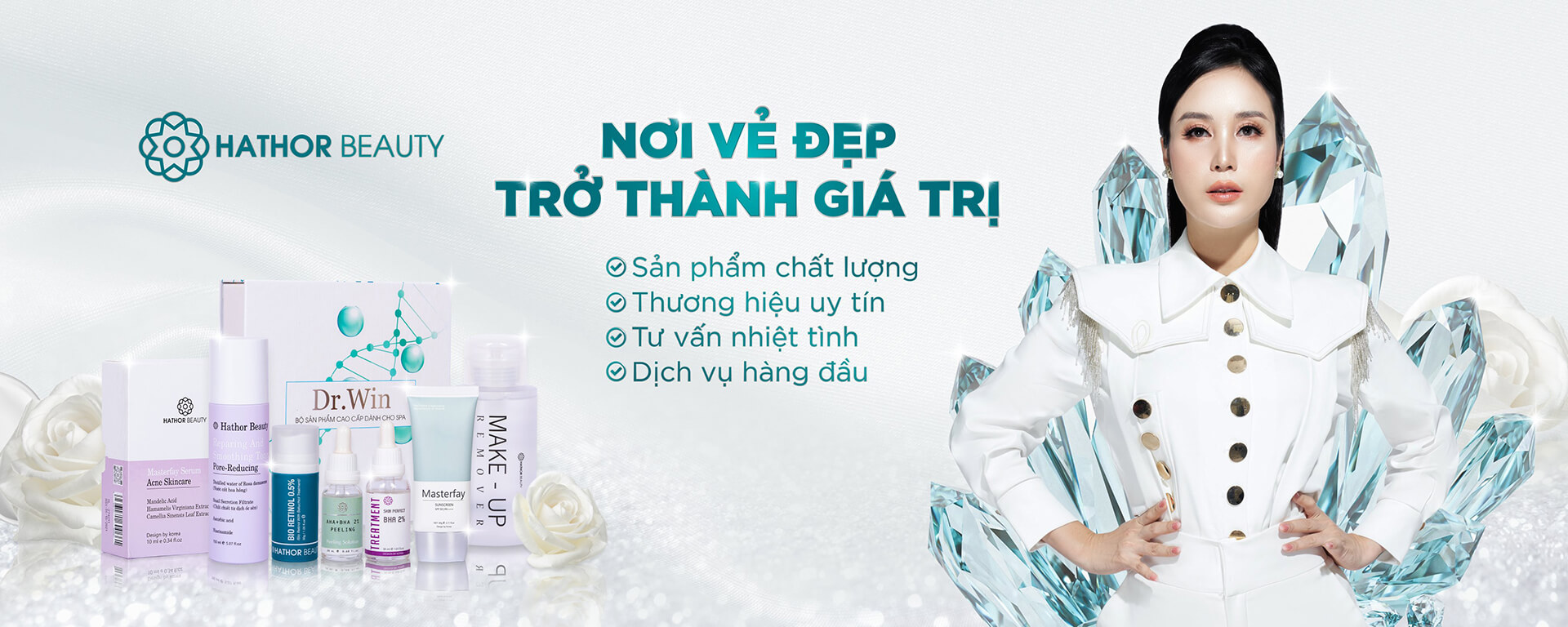 Hathor Beauty là thương hiệu Dược mỹ phẩm hàng đầu Việt Nam về sản phẩm chăm sóc sắc đẹp được nghiên cứu từ các chuyên gia hàng đầu nước ngoài theo chuẩn y khoa. Với những bước phát triển nhanh, mạnh, vững chắc, Hathor Beauty đã và đang là một trong những đơn vị uy tín trong lĩnh vực làm đẹp. Hướng đến tôn chỉ “Nơi vẻ đẹp trở thành giá trị”, chúng tôi không chỉ mang lại những sản phẩm chất lượng mà còn đem đến những dịch vụ uy tín.